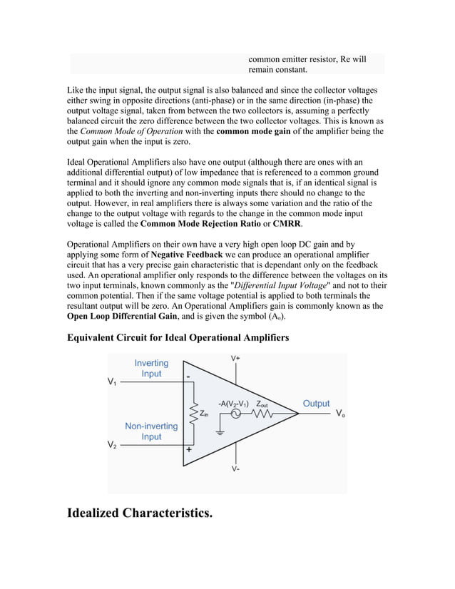 Working Principle of Operational Amplifier Open Loop Operation. In the open loop operation there is no feedback provided in the amplifier circuit. Therefore, two signals one at inverting terminal and the other at the non-inverting terminal applied then, the Op-Amp amplifies the difference of the two applied signals. This difference of the two An Operational Amplifier, or op-amp for short, is fundamentally a voltage amplifying device designed to be used with external feedback components such as resistors and capacitors between its output and input terminals. These feedback components determine the resulting function or "operation" of the amplifier and by virtue of the different Learn about OP AMP (Operational Amplifier), including its introduction, working, characteristics, types, properties, inverting vs. non-inverting, advantages, and